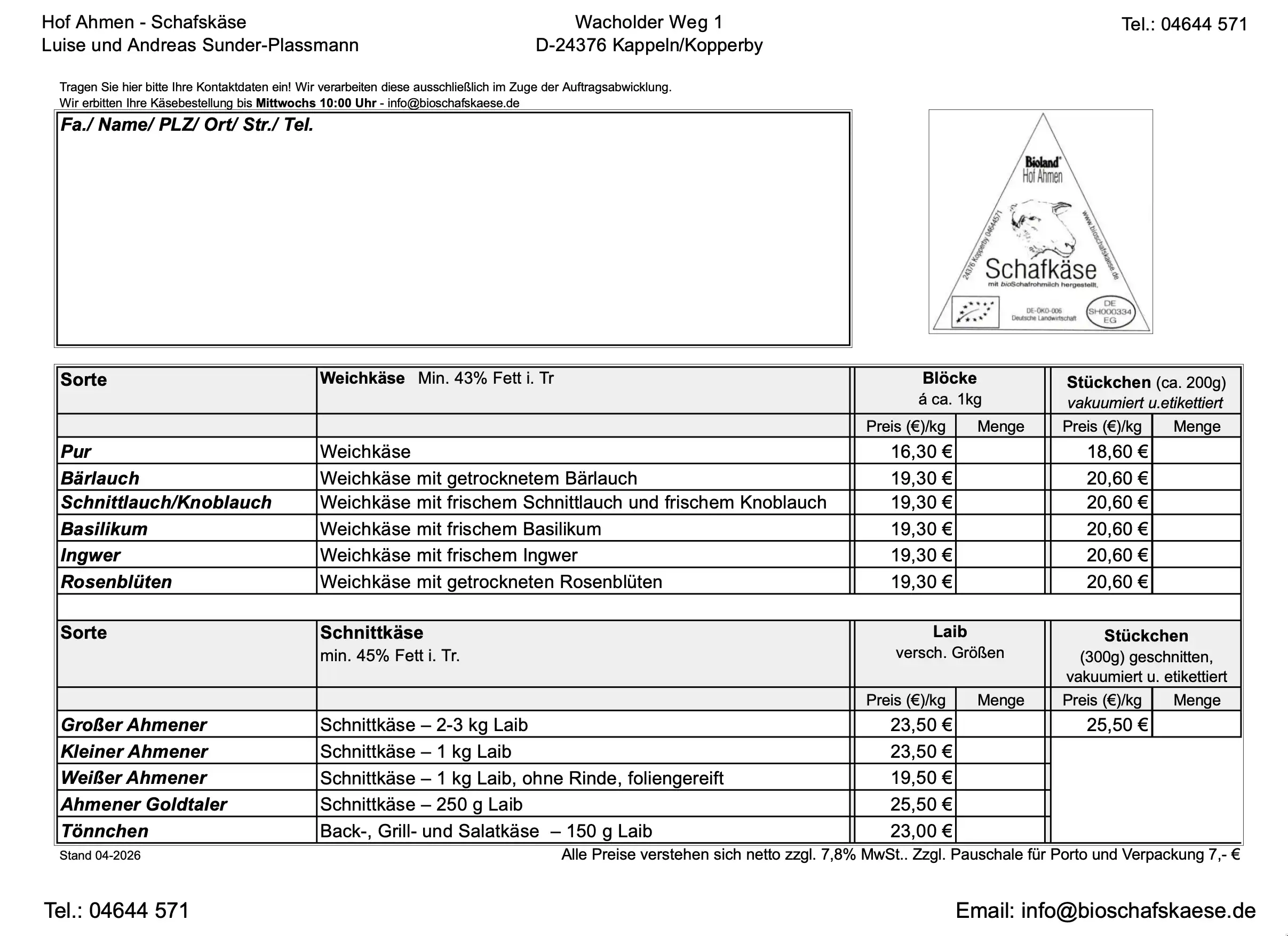 (Bitte geben Sie als Betreff "Käsebestellung" ein.)